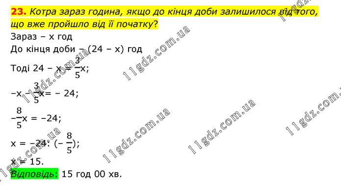 Котра зараз година, якщо до кінця доби залишилося від того, що вже пройшло від її початку? Зараз – х год До кінця доби – (24 – х) год Тоді 24 – х = 3/5х; –х – 3/5х= – 24; –8/5х = –24; х = –24: (– 8/5); х = 15. Відповідь: 15 год 00 хв.