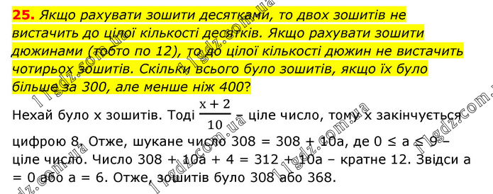 Якщо рахувати зошити десятками, то двох зошитів не вистачить до цілої кількості десятків. Якщо рахувати зошити дюжинами (тобто по 12), то до цілої кількості дюжин не вистачить чотирьох зошитів. Скільки всього було зошитів, якщо їх було більше за 300, але менше ніж 400? Нехай було х зошитів. Тоді (х + 2)/10 – ціле число, тому х закінчується цифрою 8. Отже, шукане число 308 = 308 + 10а, де 0 ≤ а ≤ 9 – ціле число. Число 308 + 10а + 4 = 312 + 10а – кратне 12. Звідси а = 0 або а = 6. Отже, зошитів було 308 або 368.
