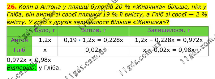 Коли в Антона у пляшці було на 20 % «Живчика» більше, ніж у Гліба, він випив зі своєї пляшки 19 % її вмісту, а Гліб зі своєї — 2 % вмісту. У кого з друзів залишилося більше «Живчика»? 0,972х < 0,98x Відповідь: у Гліба.
