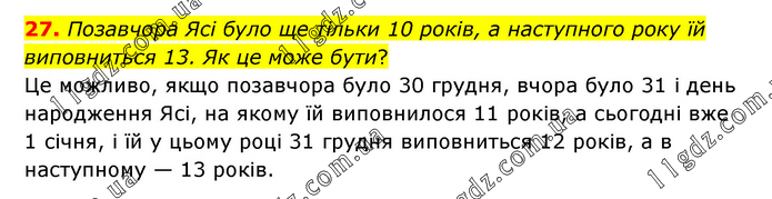 Позавчора Ясі було ще тільки 10 років, а наступного року їй виповниться 13. Як це може бути? Цe можливо, якщо позавчора було 30 грудня, вчора було 31 і день народження Ясі, на якому їй виповнилося 11 років, а сьогодні вже 1 січня, і їй у цьому році 31 грудня виповниться 12 років, а в наступному — 13 років.