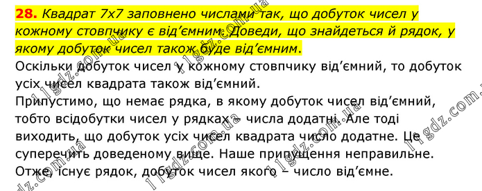 Квадрат 7x7 заповнено числами так, що добуток чисел у кожному стовпчику є від’ємним. Доведи, що знайдеться й рядок, у якому добуток чисел також буде від’ємним. Оскільки добуток чисел у кожному стовпчику від’ємний, то добуток усіх чисел квадрата також від’ємний. Припустимо, що немає рядка, в якому добуток чисел від’ємний, тобто всідобутки чисел у рядках – числа додатні. Але тоді виходить, що добуток усіх чисел квадрата число додатне. Це суперечить доведеному вище. Наше припущення неправильне. Отже, існує рядок, добуток чисел якого – число від’ємне.