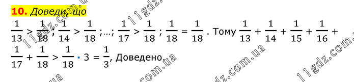 Доведи, що 1/13 > 1/18 ; 1/14 > 1/18 ;…; 1/17 > 1/18 ; 1/18 = 1/18 . Тому 1/13 + 1/14 + 1/15 + 1/16 + 1/17 + 1/18 > 1/18 · 3 = 1/3, Доведено.