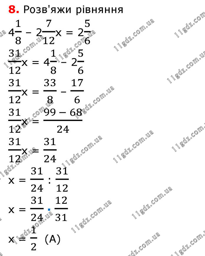 6. Магазин за день продав 120 кг бананів, що становить 3/4 усієї кількості бананів, що були в магазині. Скільки кілограмів бананів було в магазині? 120 : 3/4 = 120 · 4/3 = 160 кг (В) 7. Знайди значення виразу 11/9 : (8 + 51/3 · 21/4) = 10/9 : (8 + 16/3 · 9/4) = 10/9 : (8 + 12) = 10/9 : 20 = 10/9 · 1/20 = 1/18 (Г)