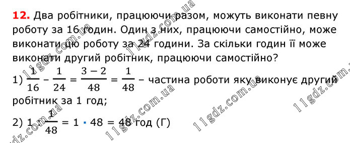 Два робітники, працюючи разом, можуть виконати певну роботу за 16 годин. Один з них, працюючи самостійно, може виконати цю роботу за 24 години. За скільки годин її може виконати другий робітник, працюючи самостійно? 1) 1/16 – 1/24 = (3 - 2)/48 = 1/48 – частина роботи яку виконує другий робітник за 1 год; 2) 1 : 1/48 = 1 · 48 = 48 год (Г)