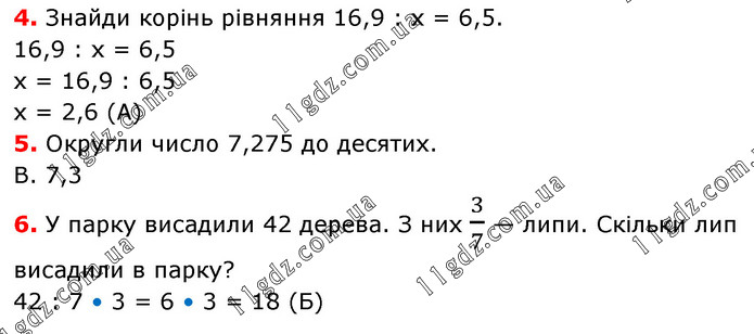 4. Знайди корінь рівняння 16,9 : х = 6,5. 16,9 : х = 6,5 х = 16,9 : 6,5 х = 2,6 (А) 5. Округли число 7,275 до десятих. В. 7,3 6. У парку висадили 42 дерева. З них 3/7 — липи. Скільки лип висадили в парку? 42 : 7 • 3 = 6 • 3 = 18 (Б)
