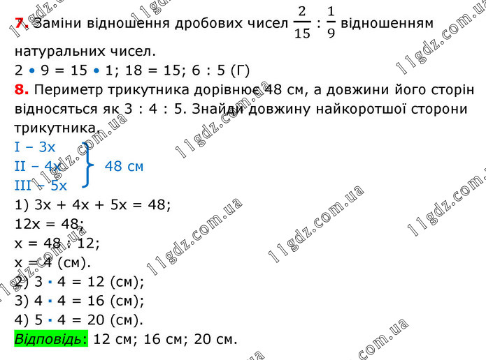 7. Заміни відношення дробових чисел 2/15 : 1/9 відношенням натуральних чисел. 2 • 9 = 15 • 1; 18 = 15; 6 : 5 (Г) 8. Периметр трикутника дорівнює 48 см, а довжини його сторін відносяться як 3 : 4 : 5. Знайди довжину найкоротшої сторони трикутника. І – 3х ІІ – 4х 48 см ІІІ – 5х 1) 3х + 4х + 5х = 48; 12х = 48; х = 48 : 12; х = 4 (см). 2) 3 · 4 = 12 (см); 3) 4 · 4 = 16 (см); 4) 5 · 4 = 20 (см). Відповідь: 12 см; 16 см; 20 см.