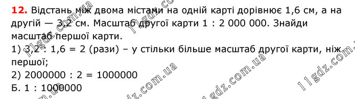 Відстань між двома містами на одній карті дорівнює 1,6 см, а на другій — 3,2 см. Масштаб другої карти 1 : 2 000 000. Знайди масштаб першої карти. 1) 3,2 : 1,6 = 2 (рази) – у стільки більше масштаб другої карти, ніж першої; 2) 2000000 : 2 = 1000000 Б. 1 : 1000000