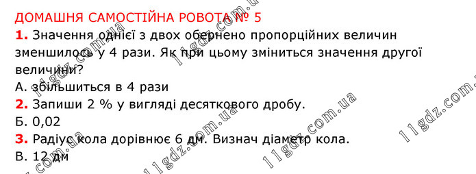 ДОМАШНЯ САМОСТІЙНА POBOTA № 5 1. Значення однієї з двох обернено пропорційних величин зменшилось у 4 рази. Як при цьому зміниться значення другої величини? А. збільшиться в 4 рази 2. Запиши 2 % у вигляді десяткового дробу. Б. 0,02 3. Радіус кола дорівнює 6 дм. Визнач діаметр кола. B. 12 дм