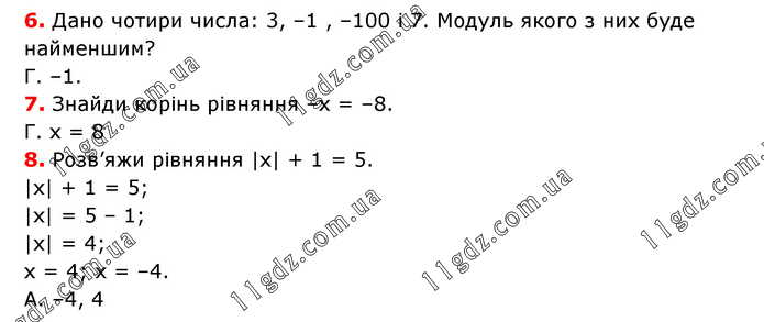 6. Дано чотири числа: 3, –1 , –100 і 7. Модуль якого з них буде найменшим? Г. –1. 7. Знайди корінь рівняння –х = –8. Г. х = 8 8. Розв’яжи рівняння |х| + 1 = 5. |х| + 1 = 5; |х| = 5 – 1; |х| = 4; х = 4; х = –4. А. –4, 4