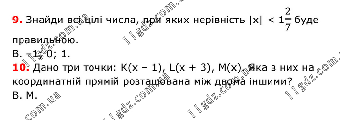 9. Знайди всі цілі числа, при яких нерівність |х| < 12/7 буде правильною. В. –1; 0; 1. 10. Дано три точки: К(х – 1), L(x + 3), М(х). Яка з них на координатній прямій розташована між двома іншими? В. M.