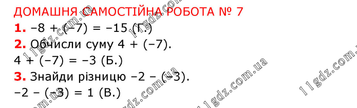 ДОМАШНЯ САМОСТІЙНА РОБОТА № 7 1. –8 + (–7) = –15 (Г.) 2. Обчисли суму 4 + (–7). 4 + (–7) = –3 (Б.) 3. Знайди різницю –2 – (–3). –2 – (–3) = 1 (В.)