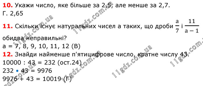 10. Укажи число, яке більше за 2,5, але менше за 2,7. Г. 2,65 11. Скільки існує натуральних чисел а таких, що дроби а/7 і 11/(а - 1) обидва неправильні? а = 7, 8, 9, 10, 11, 12 (В) 12. Знайди найменше п'ятицифрове число, кратне числу 43. 10000 : 43 = 232 (ост.24) 232 • 43 = 9976 9976 + 43 = 10019 (Г)