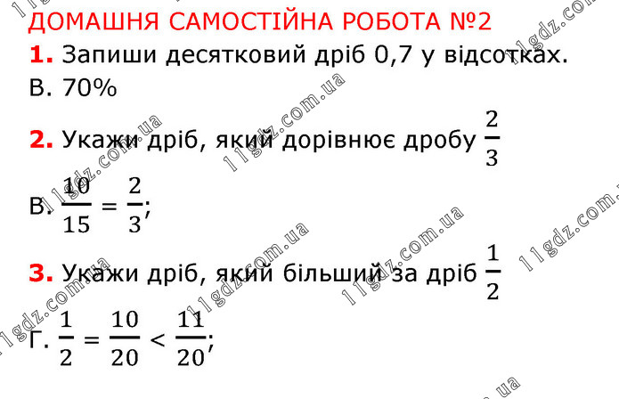 ДОМАШНЯ САМОСТІЙНА РОБОТА №2 1. Запиши десятковий дріб 0,7 у відсотках. В. 70% 2. Укажи дріб, який дорівнює дробу 2/3 В. 10/15 = 2/3; 3. Укажи дріб, який більший за дріб 1/2 Г. 1/2 = 10/20 < 11/20;