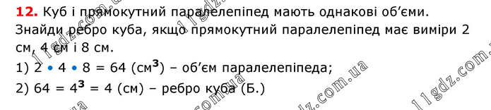 Куб і прямокутний паралелепіпед мають однакові об’єми. Знайди ребро куба, якщо прямокутний паралелепіпед має виміри 2 см, 4 см і 8 см. 1) 2 • 4 • 8 = 64 (см3) – об’єм паралелепіпеда; 2) 64 = 43 = 4 (см) – ребро куба (Б.)