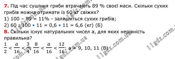 7. Під час сушіння гриби втрачають 89 % своєї маси. Скільки сухих грибів можна отримати із 60 кг свіжих? 1) 100 – 89 = 11% - залишиться сухих грибів; 2) 60 : 100 • 11 = 0,6 • 11 = 6,6 (кг) (Б) 8. Скільки існує натуральних чисел а, для яких нерівність правильна? 1/2 < a/16 < 3/4; 8/16 < a/16 < 12/16; a = 9, 10, 11 (В)