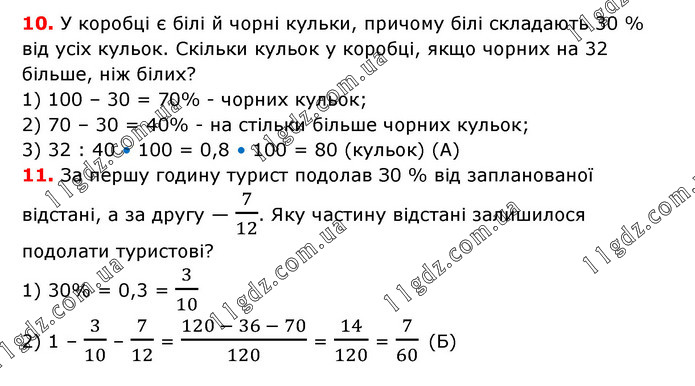 10. У коробці є білі й чорні кульки, причому білі складають 30 % від усіх кульок. Скільки кульок у коробці, якщо чорних на 32 більше, ніж білих? 1) 100 – 30 = 70% - чорних кульок; 2) 70 – 30 = 40% - на стільки більше чорних кульок; 3) 32 : 40 • 100 = 0,8 • 100 = 80 (кульок) (А) 11. За першу годину турист подолав З0 % від запланованої відстані, а за другу — 7/12. Яку частину відстані залишилося подолати туристові? 1) 30% = 0,3 = 3/10 2) 1 – 3/10 – 7/12 = (120 - 36 - 70)/120 = 14/120 = 7/60 (Б)
