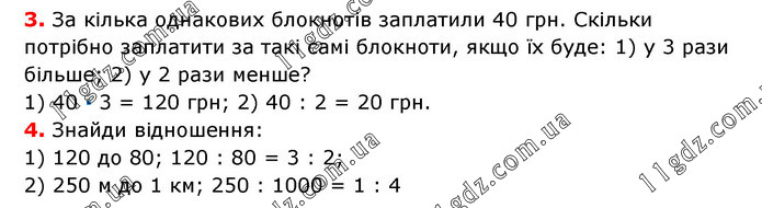 3. За кілька однакових блокнотів заплатили 40 грн. Скільки потрібно заплатити за такі самі блокноти, якщо їх буде: 1) у 3 рази більше; 2) у 2 рази менше? 1) 40 · 3 = 120 грн; 2) 40 : 2 = 20 грн. 4. Знайди відношення: 1) 120 до 80; 120 : 80 = 3 : 2; 2) 250 м до 1 км; 250 : 1000 = 1 : 4