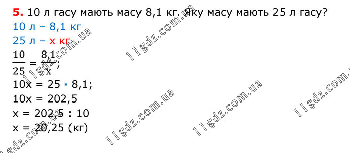 10 л гасу мають масу 8,1 кг. Яку масу мають 25 л гасу? 10 л – 8,1 кг 25 л – х кг 10/25 = 8,1/х; 10х = 25 · 8,1; 10х = 202,5 х = 202,5 : 10 х = 20,25 (кг)