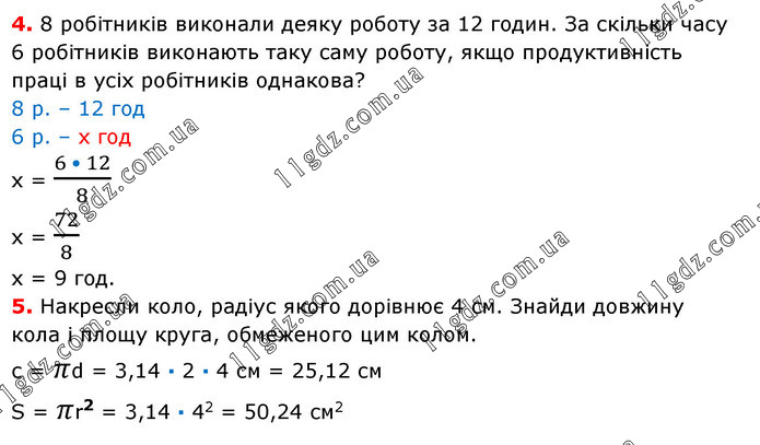 4. 8 робітників виконали деяку роботу за 12 годин. За скільки часу 6 робітників виконають таку саму роботу, якщо продуктивність праці в усіх робітників однакова? 8 р. – 12 год 6 р. – х год х = (6 • 12)/8 х = 72/8 х = 9 год. 5. Накресли коло, радіус якого дорівнює 4 см. Знайди довжину кола і площу круга, обмеженого цим колом. с = πd = 3,14 · 2 · 4 см = 25,12 см S = πr2 = 3,14 · 42 = 50,24 см2