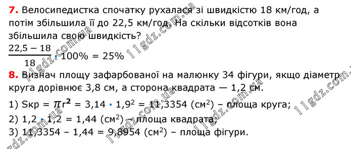 7. Велосипедистка спочатку рухалася зі швидкістю 18 км/год, а потім збільшила її до 22,5 км/год. На скільки відсотків вона збільшила свою швидкість? (22,5 - 18)/18 · 100% = 25% 8. Визнач площу зафарбованої на малюнку 34 фігури, якщо діаметр круга дорівнює 3,8 см, а сторона квадрата — 1,2 см. 1) Sкр = πr2 = 3,14 · 1,92 = 11,3354 (см2) – площа круга; 2) 1,2 · 1,2 = 1,44 (см2) – площа квадрата; 3) 11,3354 – 1,44 = 9,8954 (см2) – площа фігури.