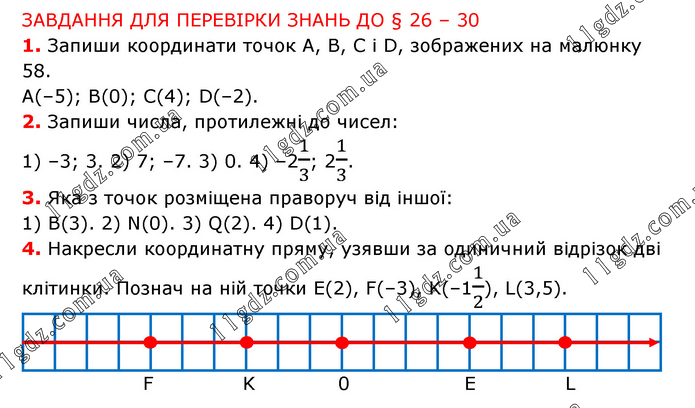 ЗАВДАННЯ ДЛЯ ПЕРЕВІРКИ ЗНАНЬ ДО § 26 – 30 1. Запиши координати точок А, B, C і D, зображених на малюнку 58. A(–5); B(0); C(4); D(–2). 2. Запиши числа, протилежні до чисел: 1) –3; 3. 2) 7; –7. 3) 0. 4) –21/3; 21/3. 3. Яка з точок розміщена праворуч від іншої: 1) В(3). 2) N(0). 3) Q(2). 4) D(1). 4. Накресли координатну пряму, узявши за одиничний відрізок дві клітинки. Познач на ній точки Е(2), F(–3), K(–11/2), L(3,5).