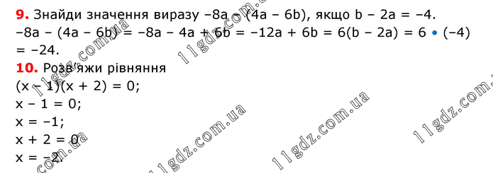 9. Знайди значення виразу –8а – (4а – 6b), якщо b – 2a = –4. –8а – (4а – 6b) = –8a – 4a + 6b = –12a + 6b = 6(b – 2a) = 6 • (–4) = –24. 10. Розв’яжи рівняння (х – 1)(х + 2) = 0; х – 1 = 0; х = –1; х + 2 = 0 х = –2.
