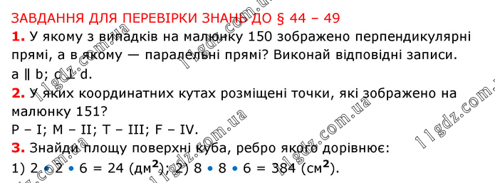 ЗАВДАННЯ ДЛЯ ПЕРЕВІРКИ ЗНАНЬ ДО § 44 – 49 1. У якому з випадків на малюнку 150 зображено перпендикулярні прямі, а в якому — паралельні прямі? Виконай відповідні записи. a ∥ b; с ⊥ d. 2. У яких координатних кутах розміщені точки, які зображено на малюнку 151? Р – І; М – ІІ; Т – ІІІ; F – IV. 3. Знайди площу поверхні куба, ребро якого дорівнює: 1) 2 • 2 • 6 = 24 (дм2); 2) 8 • 8 • 6 = 384 (см2).