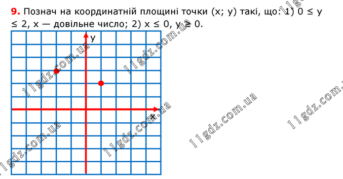 Познач на координатній площині точки (х; у) такі, що: 1) 0 ≤ у ≤ 2, х — довільне число; 2) х ≤ 0, у ≥ 0.