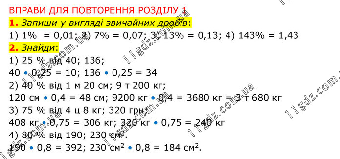 ВПРАВИ ДЛЯ ПОВТОРЕННЯ РОЗДІЛУ 1 1. Запиши у вигляді звичайних дробів: 1) 1% = 0,01; 2) 7% = 0,07; 3) 13% = 0,13; 4) 143% = 1,43 2. Знайди: 1) 25 % від 40; 136; 40 • 0,25 = 10; 136 • 0,25 = 34 2) 40 % від 1 м 20 см; 9 т 200 кг; 120 см • 0,4 = 48 см; 9200 кг • 0,4 = 3680 кг = 3 т 680 кг 3) 75 % від 4 ц 8 кг; 320 грн; 408 кг • 0,75 = 306 кг; 320 кг • 0,75 = 240 кг 4) 80 % від 190; 230 см2. 190 • 0,8 = 392; 230 см2 • 0,8 = 184 см2.