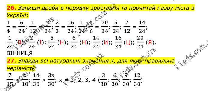 26. Запиши дроби в порядку зростання та прочитай назву міста в Україні: 1/4 = 6/24; 1/12 = 2/24; 2/3 = 16/24; 1/24; 5/6 = 20/24; 5/24; 7/12 = 14/24; 1/24 (В); 2/24 (І); 5/24 (Н); 6/24 (Н); 14/24 (И); 16/24 (Ц); 20/24 (Я). ВІННИЦЯ 27. Знайди всі натуральні значення х, для яких правильна нерівність 7/15 > х/10; 14/30 > 3х/30; х = 1, 2, 3, 4 (3/30; 6/30; 9/30; 12/30)