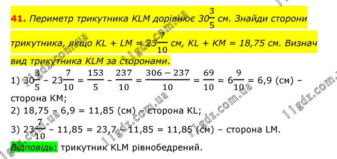 Периметр трикутника KLM дорівнює 303/5 см. Знайди сторони трикутника, якщо KL + LM = 237/10 см, KL + KM = 18,75 см. Визнач вид трикутника KLM за сторонами. 1) 303/5 – 237/10 = 153/5 – 237/10 = (306 - 237)/10 = 69/10 = 69/10 = 6,9 (см) – сторона КМ; 2) 18,75 – 6,9 = 11,85 (см) – сторона KL; 3) 237/10 – 11,85 = 23,7 – 11,85 = 11,85 (см) – сторона LM. Відповідь: трикутник KLM рівнобедрений.