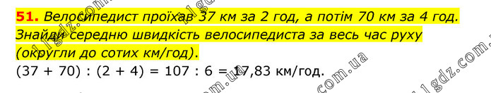 Велосипедист проїхав 37 км за 2 год, а потім 70 км за 4 год. Знайди середню швидкість велосипедиста за весь час руху (округли до сотих км/год). (37 + 70) : (2 + 4) = 107 : 6 = 17,83 км/год.