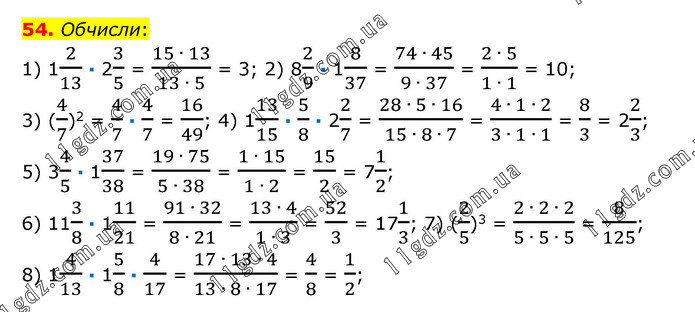 52. Округли періодичні дроби до тисячних і обчисли: 1) 2,(513) + 4,9 – 0,2(45) = 2,514 + 4,9 – 0,245 = 7,169; 2) 2,17(3) – 0,(7) + 4,(31) = 2,173 – 0,778 + 4,313 = 5,708. 53. Виконай множення: 1) 1/8 · 1/2 = 1/16; 2) 3/5 · 5/7 = 3/7; 3) 3/7 · 14/19 = 6/19; 4) 7/9 · 9/7 = 1; 5) 2/3 · 9/16 = 6/16; 6) 5 · 1/3 = 5/3 = 12/3; 7) 4/9 · 3 = 4/3 = 11/3; 8) 2/3 · 12 = 2 · 4 = 8.