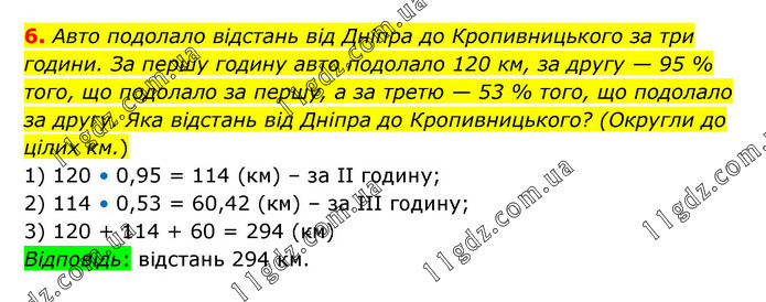 Авто подолало відстань від Дніпра до Кропивницького за три години. За першу годину авто подолало 120 км, за другу — 95 % того, що подолало за першу, а за третю — 53 % того, що подолало за другу. Яка відстань від Дніпра до Кропивницького? (Округли до цілих км.) 1) 120 • 0,95 = 114 (км) – за ІІ годину; 2) 114 • 0,53 = 60,42 (км) – за ІІІ годину; 3) 120 + 114 + 60 = 294 (км) Відповідь: відстань 294 км.