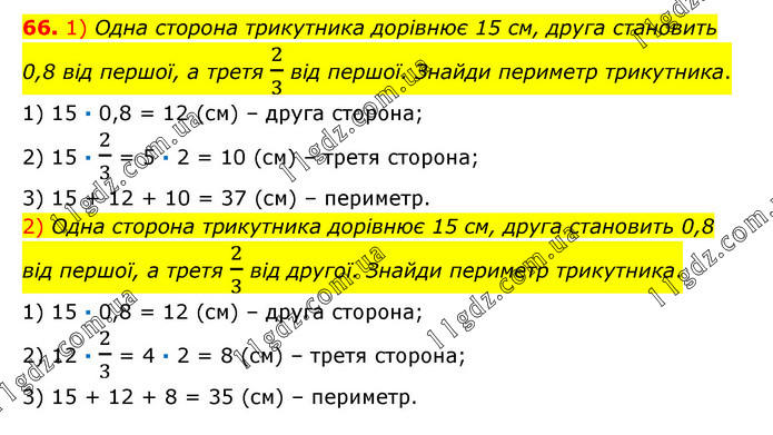 1) Одна сторона трикутника дорівнює 15 см, друга становить 0,8 від першої, а третя 2/3 від першої. Знайди периметр трикутника. 1) 15 · 0,8 = 12 (см) – друга сторона; 2) 15 · 2/3 = 5 · 2 = 10 (см) – третя сторона; 3) 15 + 12 + 10 = 37 (см) – периметр. 2) Одна сторона трикутника дорівнює 15 см, друга становить 0,8 від першої, а третя 2/3 від другої. Знайди периметр трикутника. 1) 15 · 0,8 = 12 (см) – друга сторона; 2) 12 · 2/3 = 4 · 2 = 8 (см) – третя сторона; 3) 15 + 12 + 8 = 35 (см) – периметр.