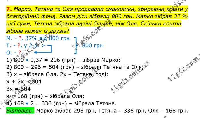 Марко, Тетяна та Оля продавали смаколики, збираючи кошти у благодійний фонд. Разом діти зібрали 800 грн. Марко зібрав 37 % цієї суми, Тетяна зібрала вдвічі більше, ніж Оля. Скільки коштів зібрав кожен із друзів? М. - ?, 37% від 800 грн Т. - ?, у 2 р. > 800 грн О. - ? 1) 800 • 0,37 = 296 (грн) – зібрав Марко; 2) 800 – 296 = 504 (грн) – зібрали Тетяна та Оля; 3) х – зібрала Оля, 2х – Тетяна, тоді: х + 2х = 504 3х = 504 х = 168 (грн) – зібрала Оля; 4) 168 • 2 = 336 (грн) – зібрала Тетяна. Відповідь: Марко зібрав 296 грн, Тетяна – 336 грн, Оля – 168 грн.