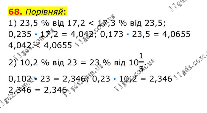 Порівняй: 1) 23,5 % від 17,2 < 17,3 % від 23,5; 0,235 · 17,2 = 4,042; 0,173 · 23,5 = 4,0655 4,042 < 4,0655 2) 10,2 % від 23 = 23 % від 101/5. 0,102 · 23 = 2,346; 0,23 · 10,2 = 2,346 2,346 = 2,346