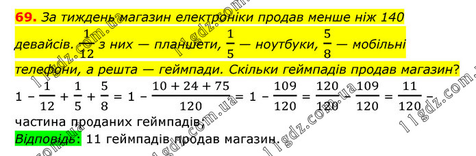 За тиждень магазин електроніки продав менше ніж 140 девайсів. 1/12 з них — планшети, 1/5 — ноутбуки, 5/8 — мобільні телефони, а решта — геймпади. Скільки геймпадів продав магазин? 1 – 1/12 + 1/5 + 5/8 = 1 – (10 + 24 + 75)/120 = 1 – 109/120 = 120/120 – 109/120 = 11/120 – частина проданих геймпадів; Відповідь: 11 геймпадів продав магазин.