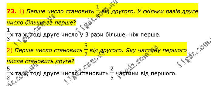 1) Перше число становить 1/3 від другого. У скільки разів друге число більше за перше? 1/3х та х, тоді друге число у 3 рази більше, ніж перше. 2) Перше число становить 5/2 від другого. Яку частину першого числа становить друге? 5/2х та х, тоді друге число становить 2/5 частини від першого.