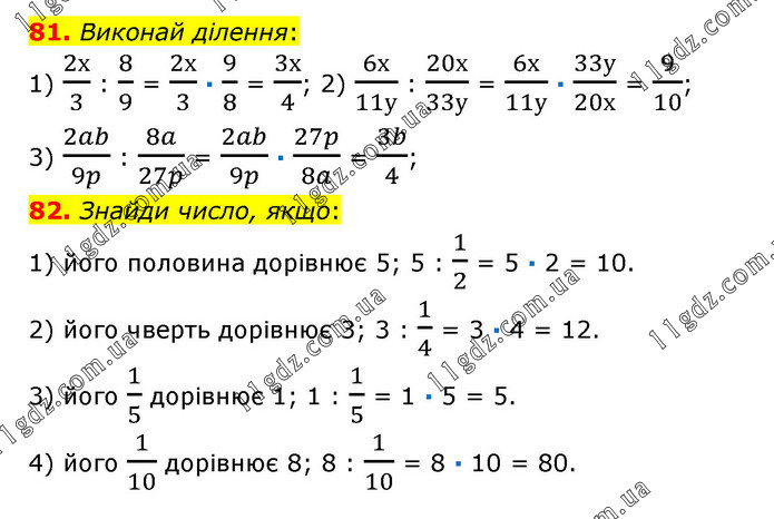 81. Виконай ділення: 1) 2х/3 : 8/9 = 2х/3 · 9/8 = 3х/4; 2) 6х/11у : 20х/33у = 6х/11у · 33у/20х = 9/10; 3) 2ab/9p : 8a/27p = 2ab/9p · 27p/8a = 3b/4; 82. Знайди число, якщо: 1) його половина дорівнює 5; 5 : 1/2 = 5 · 2 = 10. 2) його чверть дорівнює 3; 3 : 1/4 = 3 · 4 = 12. 3) його 1/5 дорівнює 1; 1 : 1/5 = 1 · 5 = 5. 4) його 1/10 дорівнює 8; 8 : 1/10 = 8 · 10 = 80.