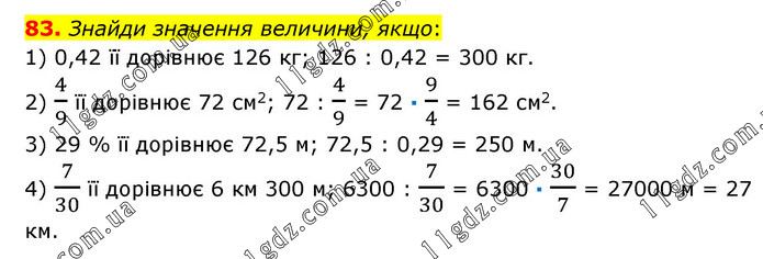 Знайди значення величини, якщо: 1) 0,42 її дорівнює 126 кг; 126 : 0,42 = 300 кг. 2) 4/9 її дорівнює 72 см2; 72 : 4/9 = 72 · 9/4 = 162 см2. 3) 29 % її дорівнює 72,5 м; 72,5 : 0,29 = 250 м. 4) 7/30 її дорівнює 6 км 300 м; 6300 : 7/30 = 6300 · 30/7 = 27000 м = 27 км.
