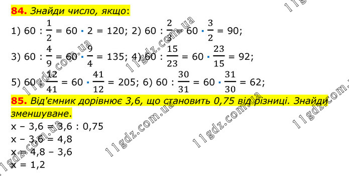 84. Знайди число, якщо: 1) 60 : 1/2 = 60 · 2 = 120; 2) 60 : 2/3 = 60 · 3/2 = 90; 3) 60 : 4/9 = 60 · 9/4 = 135; 4) 60 : 15/23 = 60 · 23/15 = 92; 5) 60 : 12/41 = 60 · 41/12 = 205; 6) 60 : 30/31 = 60 · 31/30 = 62; 85. Від'ємник дорівнює 3,6, що становить 0,75 від різниці. Знайди зменшуване. х – 3,6 = 3,6 : 0,75 х – 3,6 = 4,8 х = 4,8 – 3,6 х = 1,2