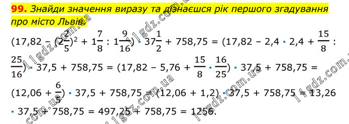 Знайди значення виразу та дізнаєшся рік першого згадування про місто Львів. (17,82 – (22/5)2 + 17/8 : 19/16) · 371/2 + 758,75 = (17,82 – 2,4 · 2,4 + 15/8 : 25/16) · 37,5 + 758,75 = (17,82 – 5,76 + 15/8 · 16/25) · 37,5 + 758,75 = (12,06 + 6/5) · 37,5 + 758,75 = (12,06 + 1,2) · 37,5 + 758,75 = 13,26 · 37,5 + 758,75 = 497,25 + 758,75 = 1256.