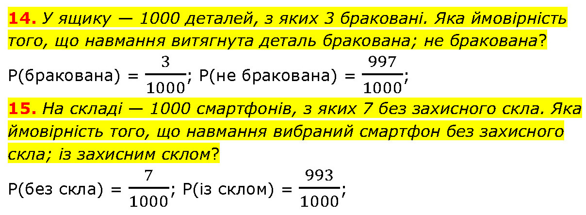 14. У ящику — 1000 деталей, з яких 3 браковані. Яка ймовірність того, що навмання витягнута деталь бракована; не бракована? P(бракована) = 3/1000; P(не бракована) = 997/1000; 15. На складі — 1000 смартфонів, з яких 7 без захисного скла. Яка ймовірність того, що навмання вибраний смартфон без захисного скла; із захисним склом? P(без скла) = 7/1000; P(із склом) = 993/1000;