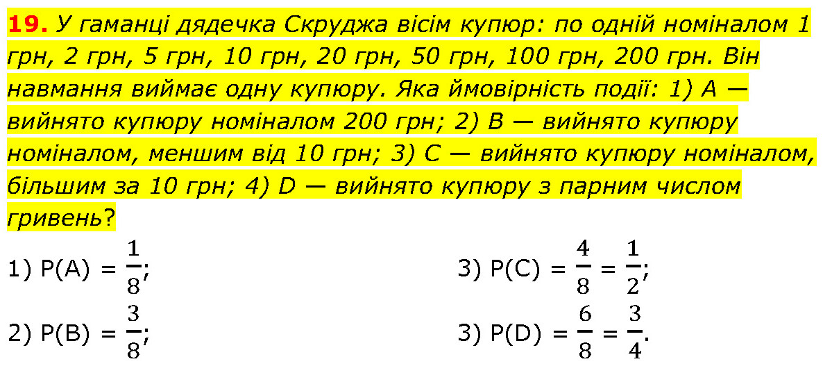 У гаманці дядечка Скруджа вісім купюр: по одній номіналом 1 грн, 2 грн, 5 грн, 10 грн, 20 грн, 50 грн, 100 грн, 200 грн. Він навмання виймає одну купюру. Яка ймовірність події: 1) А — вийнято купюру номіналом 200 грн; 2) В — вийнято купюру номіналом, меншим від 10 грн; 3) C — вийнято купюру номіналом, більшим за 10 грн; 4) D — вийнято купюру з парним числом гривень? 1) P(А) = 1/8; 2) P(В) = 3/8; 3) P(С) = 4/8 = 1/2; 3) P(D) = 6/8 = 3/4.