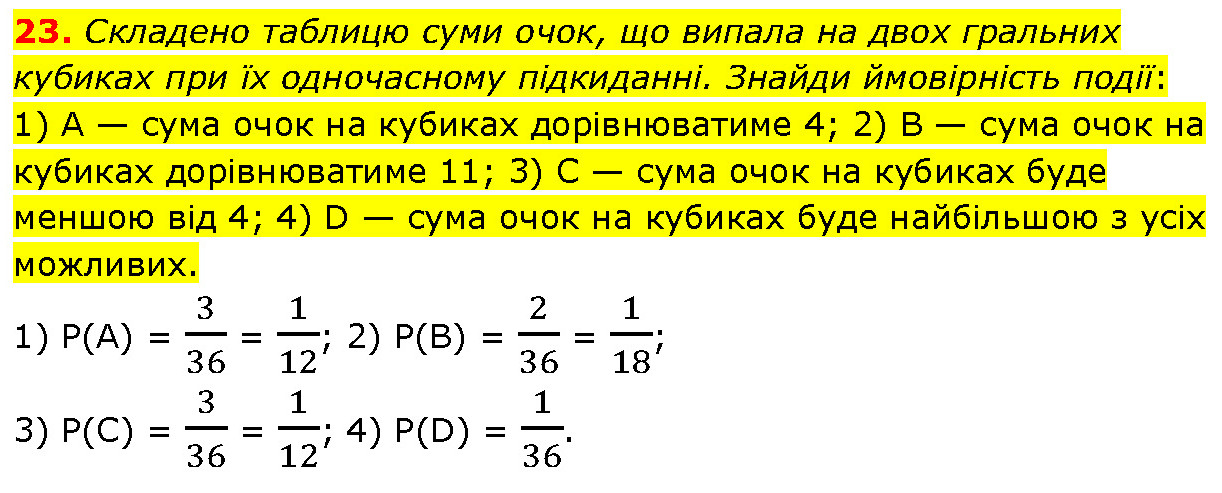 Складено таблицю суми очок, що випала на двох гральних кубиках при їх одночасному підкиданні. Знайди ймовірність події: 1) А — сума очок на кубиках дорівнюватиме 4; 2) В — сума очок на кубиках дорівнюватиме 11; 3) C — сума очок на кубиках буде меншою від 4; 4) D — сума очок на кубиках буде найбільшою з усіх можливих. 1) P(А) = 3/36 = 1/12; 2) P(В) = 2/36 = 1/18; 3) P(С) = 3/36 = 1/12; 4) P(D) = 1/36.