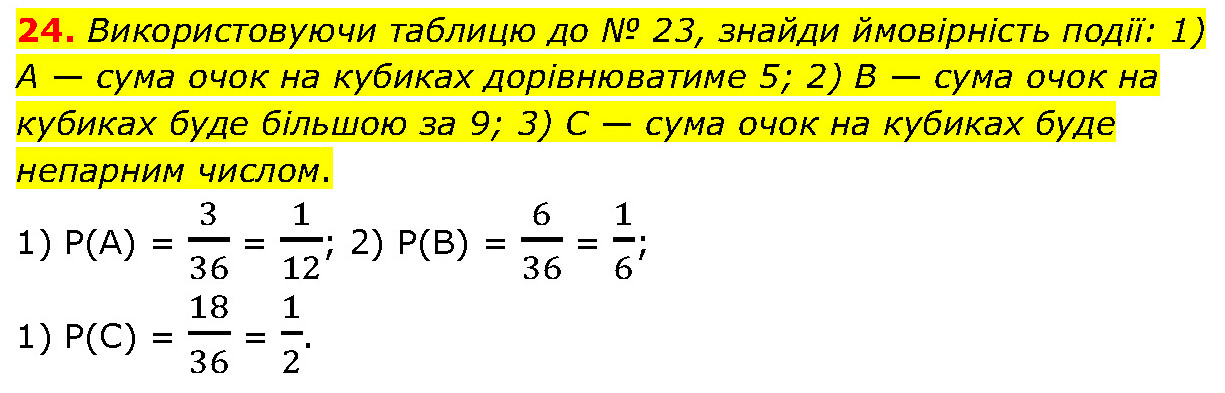 Використовуючи таблицю до № 23, знайди ймовірність події: 1) А — сума очок на кубиках дорівнюватиме 5; 2) В — сума очок на кубиках буде більшою за 9; 3) C — сума очок на кубиках буде непарним числом. 1) P(А) = 3/36 = 1/12; 2) P(В) = 6/36 = 1/6; 1) P(С) = 18/36 = 1/2.