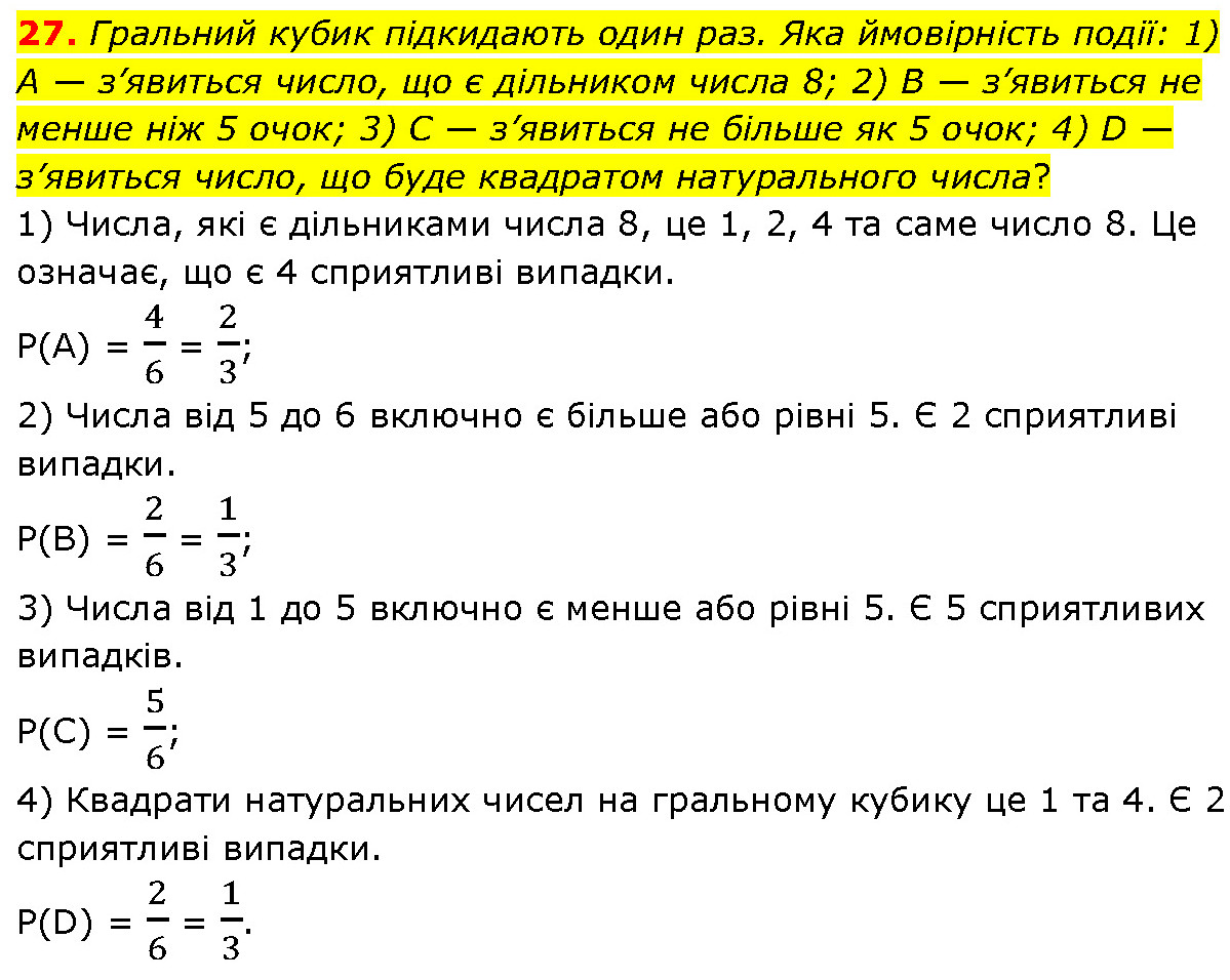 Гральний кубик підкидають один раз. Яка ймовірність події: 1) А — з’явиться число, що є дільником числа 8; 2) В — з’явиться не менше ніж 5 очок; 3) C — з’явиться не більше як 5 очок; 4) D — з’явиться число, що буде квадратом натурального числа? 1) Числа, які є дільниками числа 8, це 1, 2, 4 та саме число 8. Це означає, що є 4 сприятливі випадки. P(А) = 4/6 = 2/3; 2) Числа від 5 до 6 включно є більше або рівні 5. Є 2 сприятливі випадки. P(В) = 2/6 = 1/3; 3) Числа від 1 до 5 включно є менше або рівні 5. Є 5 сприятливих випадків. P(С) = 5/6; 4) Квадрати натуральних чисел на гральному кубику це 1 та 4. Є 2 сприятливі випадки. P(D) = 2/6 = 1/3.