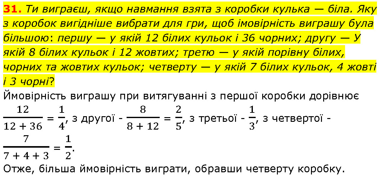Ти виграєш, якщо навмання взята з коробки кулька — біла. Яку з коробок вигідніше вибрати для гри, щоб імовірність виграшу була більшою: першу — у якій 12 білих кульок і 36 чорних; другу — У якій 8 білих кульок і 12 жовтих; третю — у якій порівну білих, чорних та жовтих кульок; четверту — у якій 7 білих кульок, 4 жовті і 3 чорні? Ймовірність виграшу при витягуванні з першої коробки дорівнює 12/(12 + 36) = 1/4, з другої - 8/(8 + 12) = 2/5, з третьої - 1/3, з четвертої - 7/(7 + 4 + 3) = 1/2. Отже, більша ймовірність виграти, обравши четверту коробку.