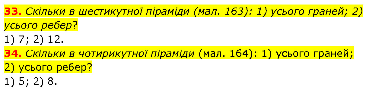33. Скільки в шестикутної піраміди (мал. 163): 1) усього граней; 2) усього ребер? 1) 7; 2) 12. 34. Скільки в чотирикутної піраміди (мал. 164): 1) усього граней; 2) усього ребер? 1) 5; 2) 8.